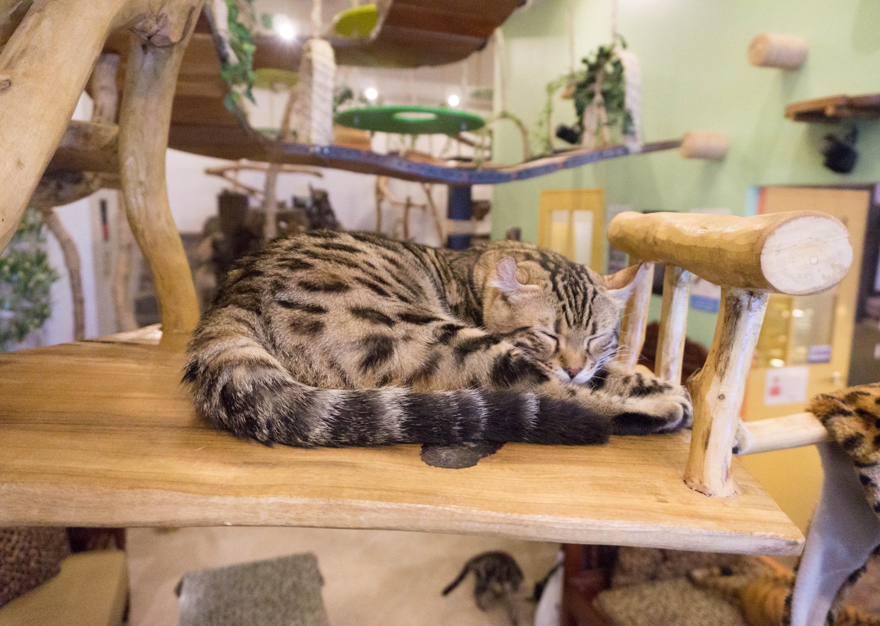 The cafe is divided into three parts: the cafe, the cat room (Bengal Brew) and the dog room (Wolf & Bear).The cafe is where you order your food and drinks and change footwear. The cat houses the Bengal Cats and the two African Servals. The dog room houses different breeds including, Siberian Huskies, a Poodle, Alaskan Malamutes, Pugs and many more. This is also the place for dining.